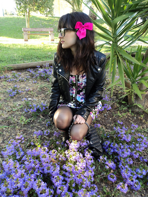 Passando ao meu look, hoje o fio condutor do visual, foi o meu vestido com print floral (como é facil de perceber :)), para cortar ligeiramente o ar bonequinha demasiado composta, combinei-o com um perfecto de cabedal; Em relação aos acessórios, derbies pretos, malinha tipo "chanel com corrente prata, "mega" laço fúchsia e como de costume os meus queridos óculos geek ;)))))