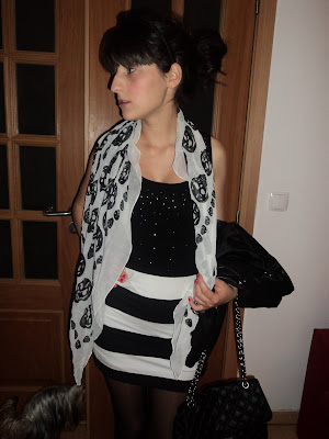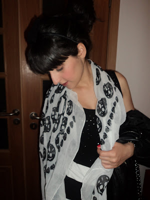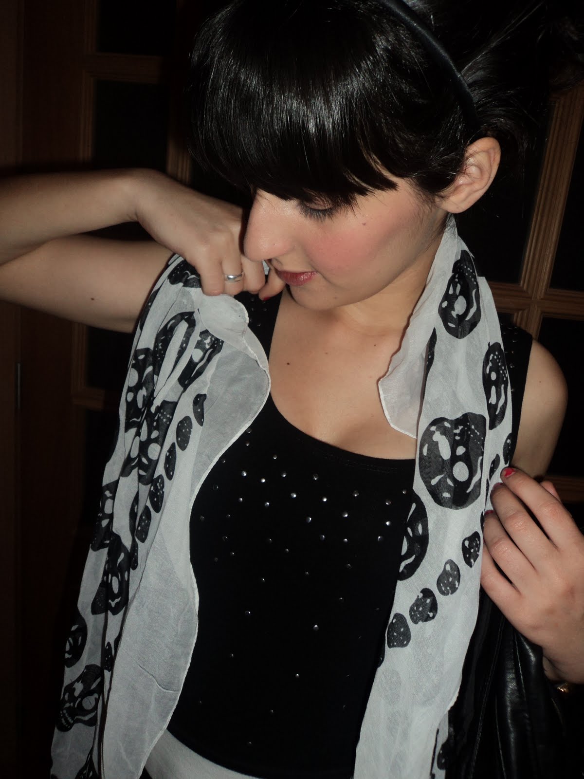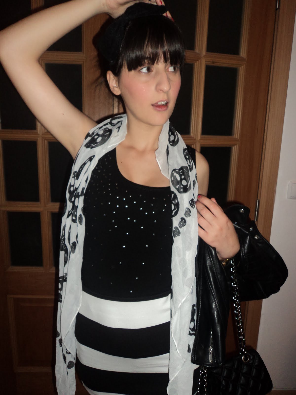 Com isto tudo, nem vale a pena dizer que o fio condutor do look de hoje é o meu novo lenço com print de caveiras (O meu verdadeiro achado, dos últimos tempos!!). Combinei-o com um perfecto de cabedal, top preto com tachas, saia de cintura subida com print de riscas e All Star pretos :))