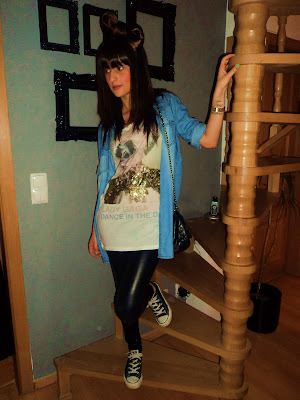Combinei o mega Lady Gaga hair bow, com uma t'shirt da mesma, do single "Dance in the dark", camisa de ganga oversized, treggings pretas, all star pretos e apontamentos gold :))