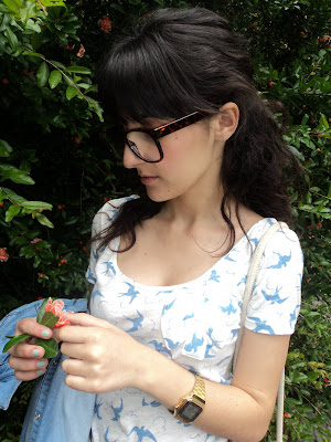 Hoje o fio condutor do meu look, é o body com print de andorinhas, inspirado na última colecção da miu miu. Colecção pela qual, como vos tinha dito no post "miu miu cats", sou completamente apaixonada!!! :)