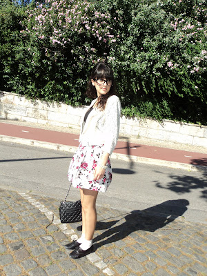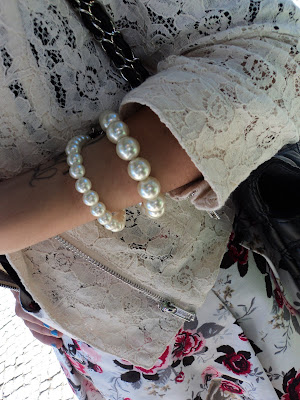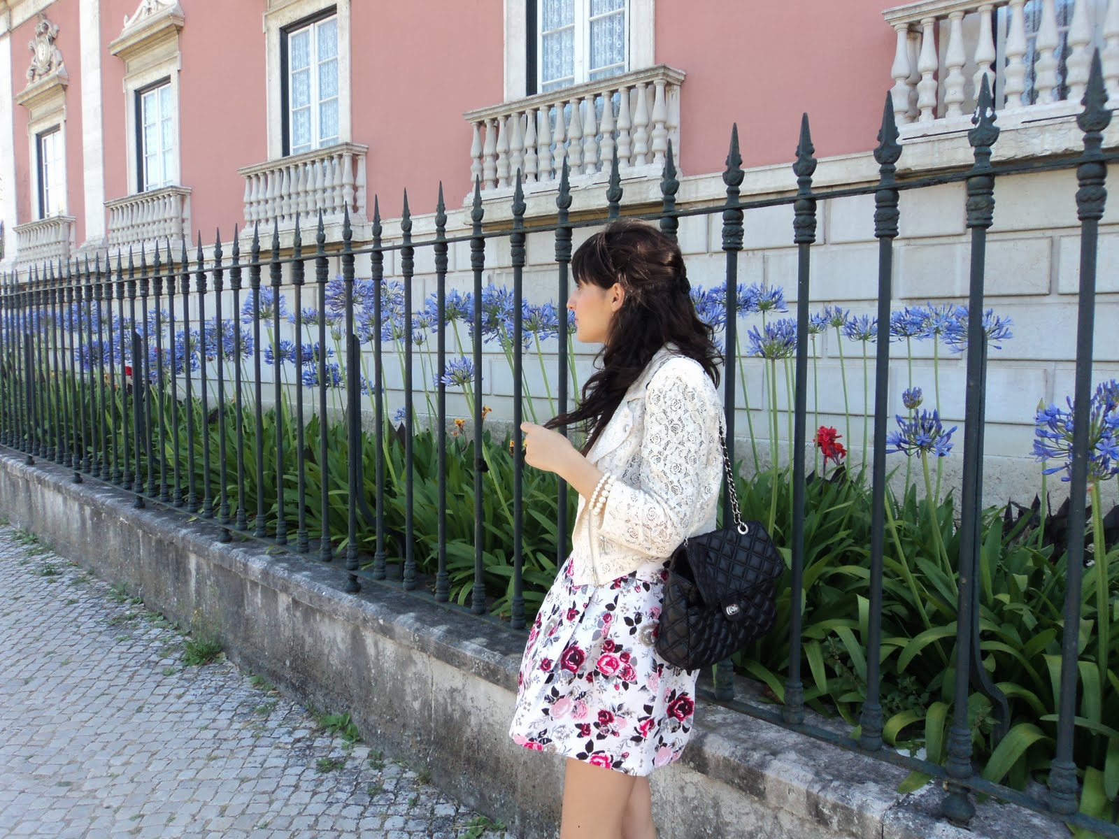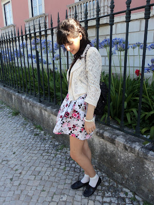 Combinei o perfecto de renda, com uma t'shirt preta, saia de cintura subida com print floral e acessórios pretos (malinha e derbies).