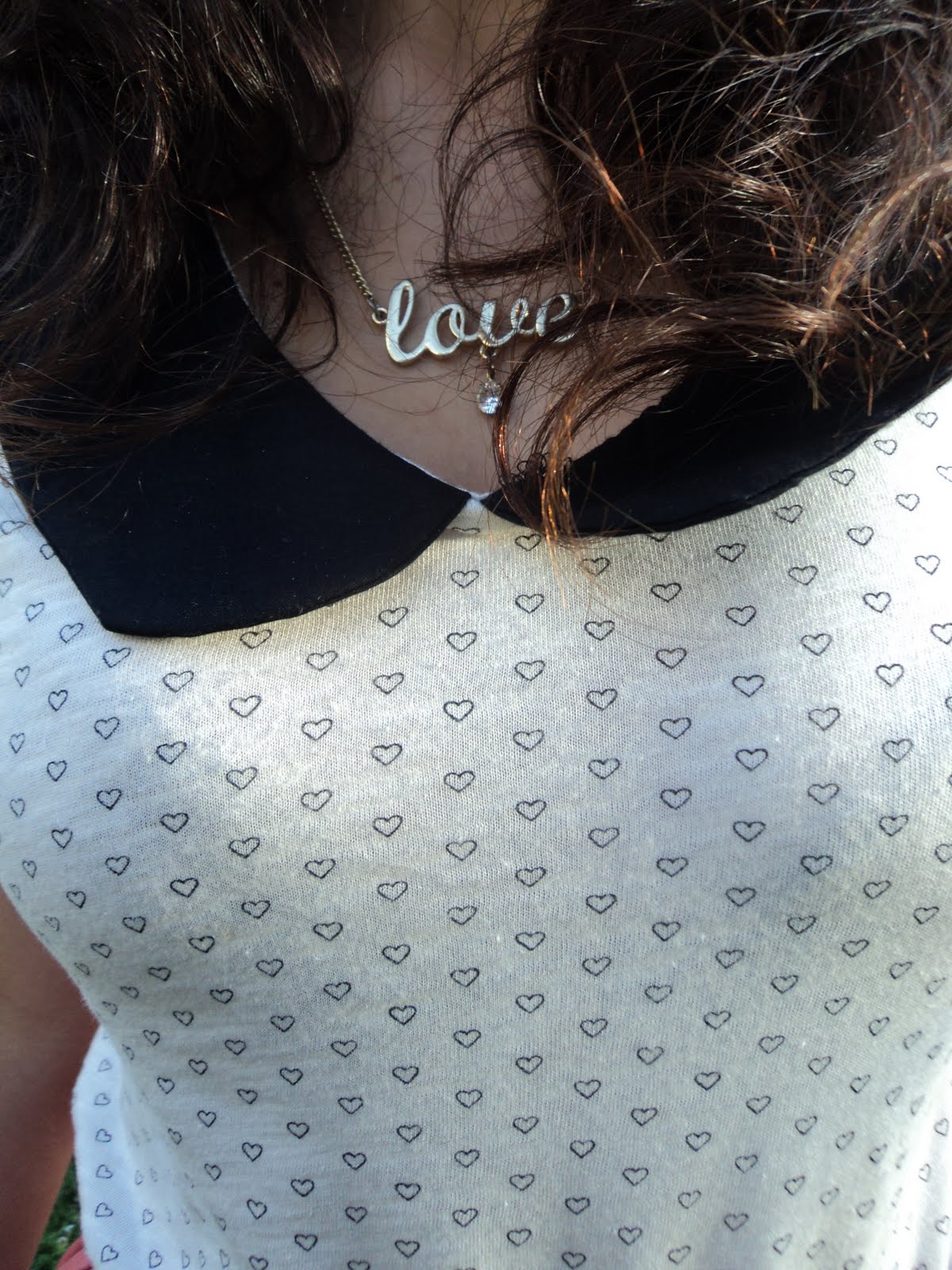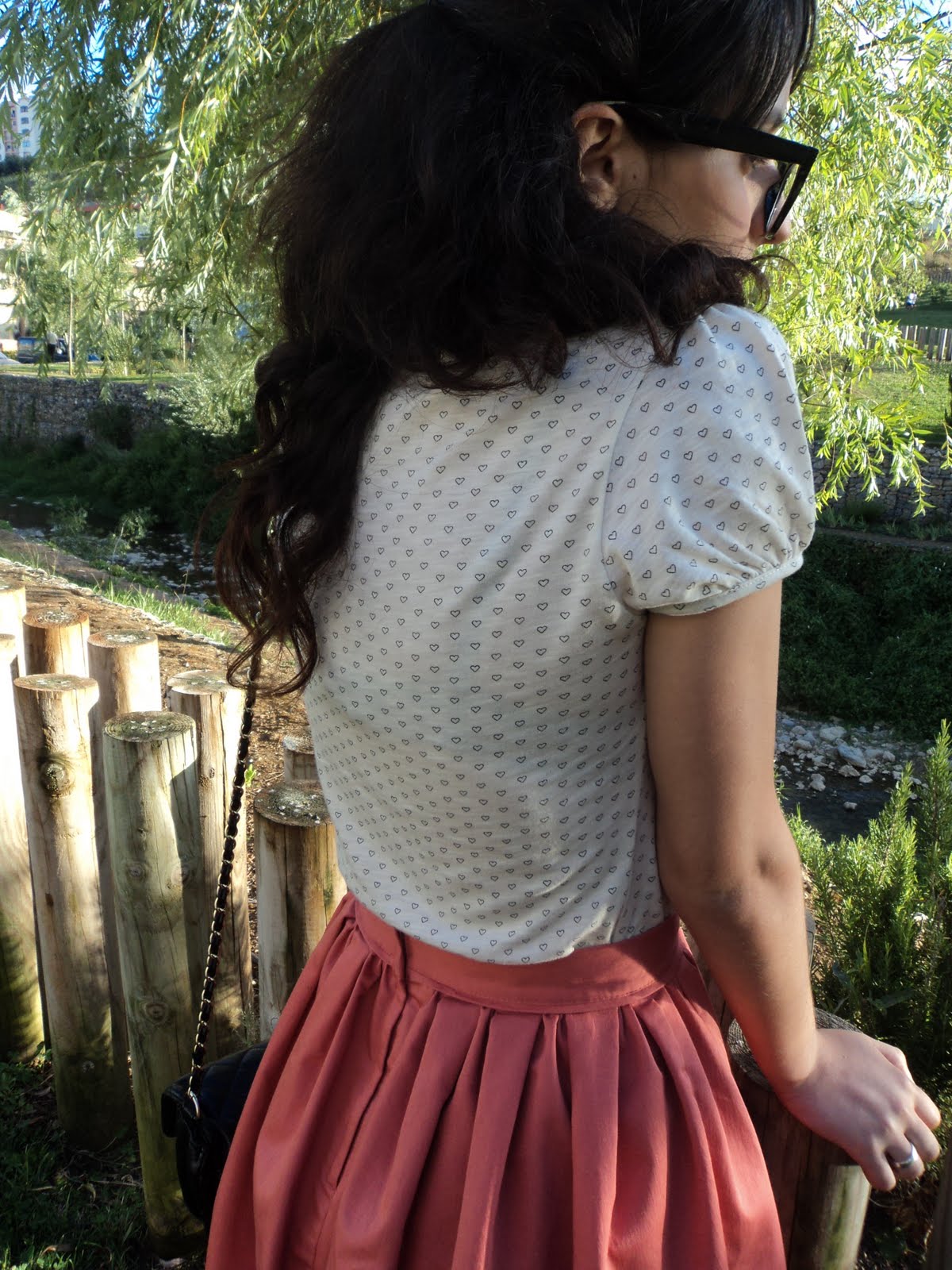 Hoje vesti a minha saia peach (uma das minhas preferidas), com uma blusinha beige com gola e print de corações, malinha preta, derbies pretos e apontamentos gold :))