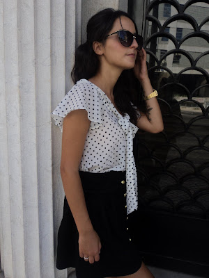 Hoje vesti a minha blusinha com print de pintinhas, com uma saia de cintura subida preta, sabrinas bicolores, malinha com laço vichy e apontamentos gold ^^ Um look não muito diferente do habitual, mas que é totalmente a minha cara, totalmente ChloeMarieAntoinete :))